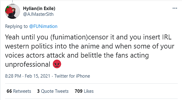 AJMasterSith writes, “Yeah until you (funimation)censor it and you insert IRL western politics into the anime and when some of your voice actors attack and belittle the fans acting unprofessional.”