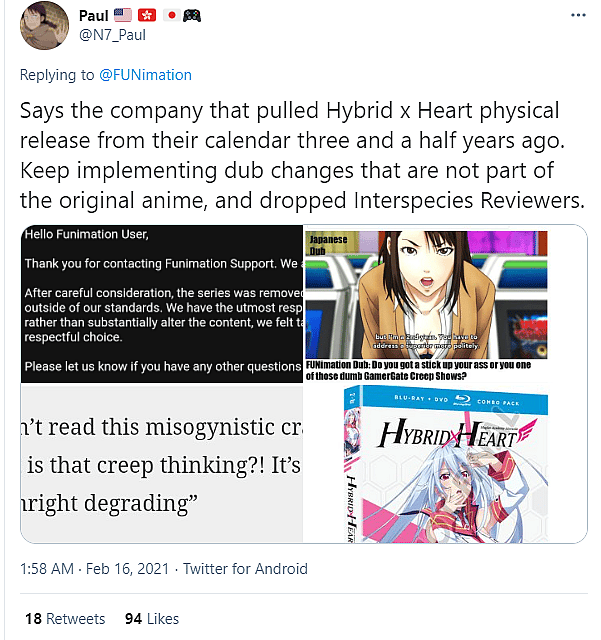 N7_Paul wrote, “Says the company that pulled Hybrid X Heart physical release from their calendar three and a half years ago. Keep implementing dub changes that are not part of the original anime, and dropped Interspecies Reviewers.”