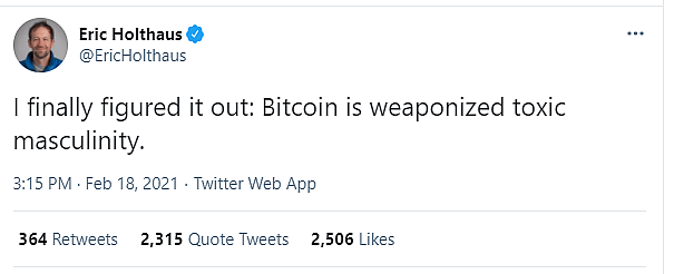 Holthaus took to Twitter to write, “I finally figured it out: Bitcoin is weaponized toxic masculinity.”
