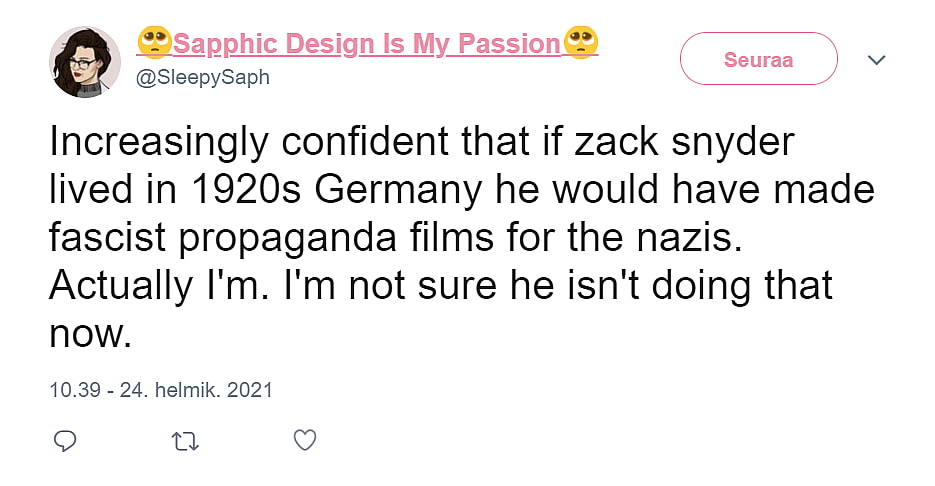 They wrote, “Increasingly confident that if zack snyder lived in 1920s Germany he would have made fascist propaganda films for the nazis. Actually I’m. I’m not sure he isn’t doing that now.”