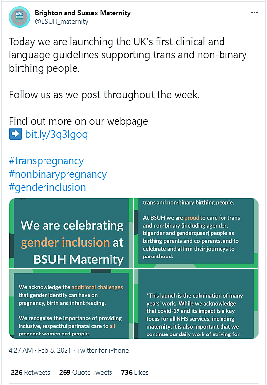 The Brighton and Sussex Maternity official Twitter account that is part of Britain’s National Health Services is acting as the word police.