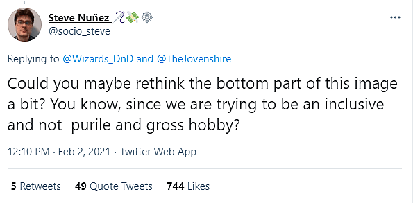 Steve Nunez wrote, “Could you maybe rethink the bottom part of this image a bit? You know, since we are trying to be an inclusive and not purile and gross hobby.”