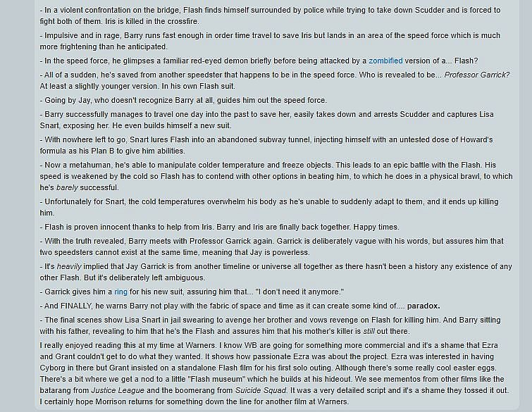 The Reddit post ends with the anonymous leaker admitting he read the script while employed by Warner Bros. He adds there were more Easter Eggs, like the Flash museum.