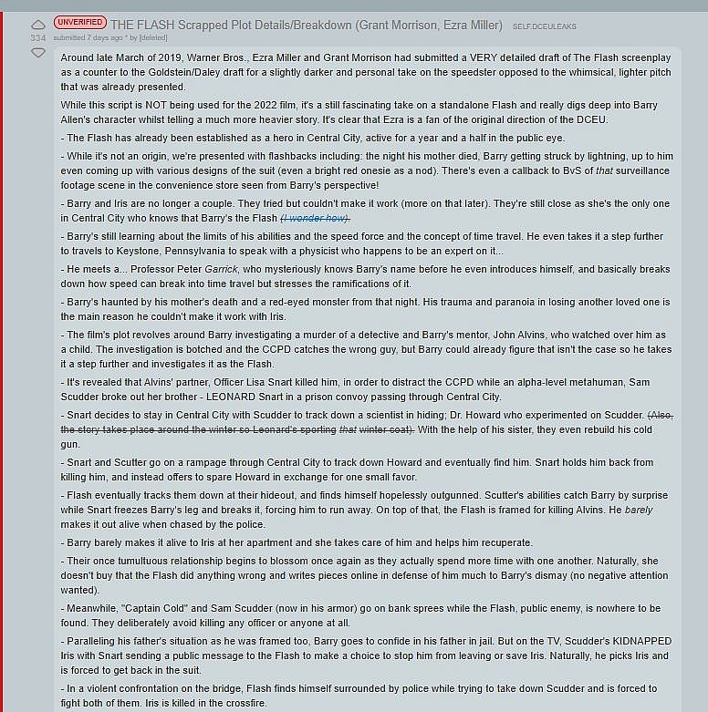 Warstu was messaged on Instagram about the leak. He compared the plot to season one of The CW series and likes the Miller-Morrison script better as a proper introduction of The Flash than the movie we’re getting.