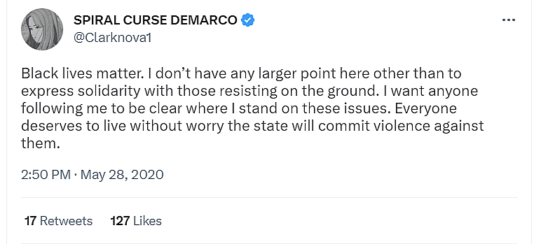 He continued, “Black lives matter. I don’t have any larger point here other than to express solidarity with those resisting on the ground. I want anyone following me to be clear where I stand on these issues. Everyone deserves to live without worry the state will commit violence against them.”