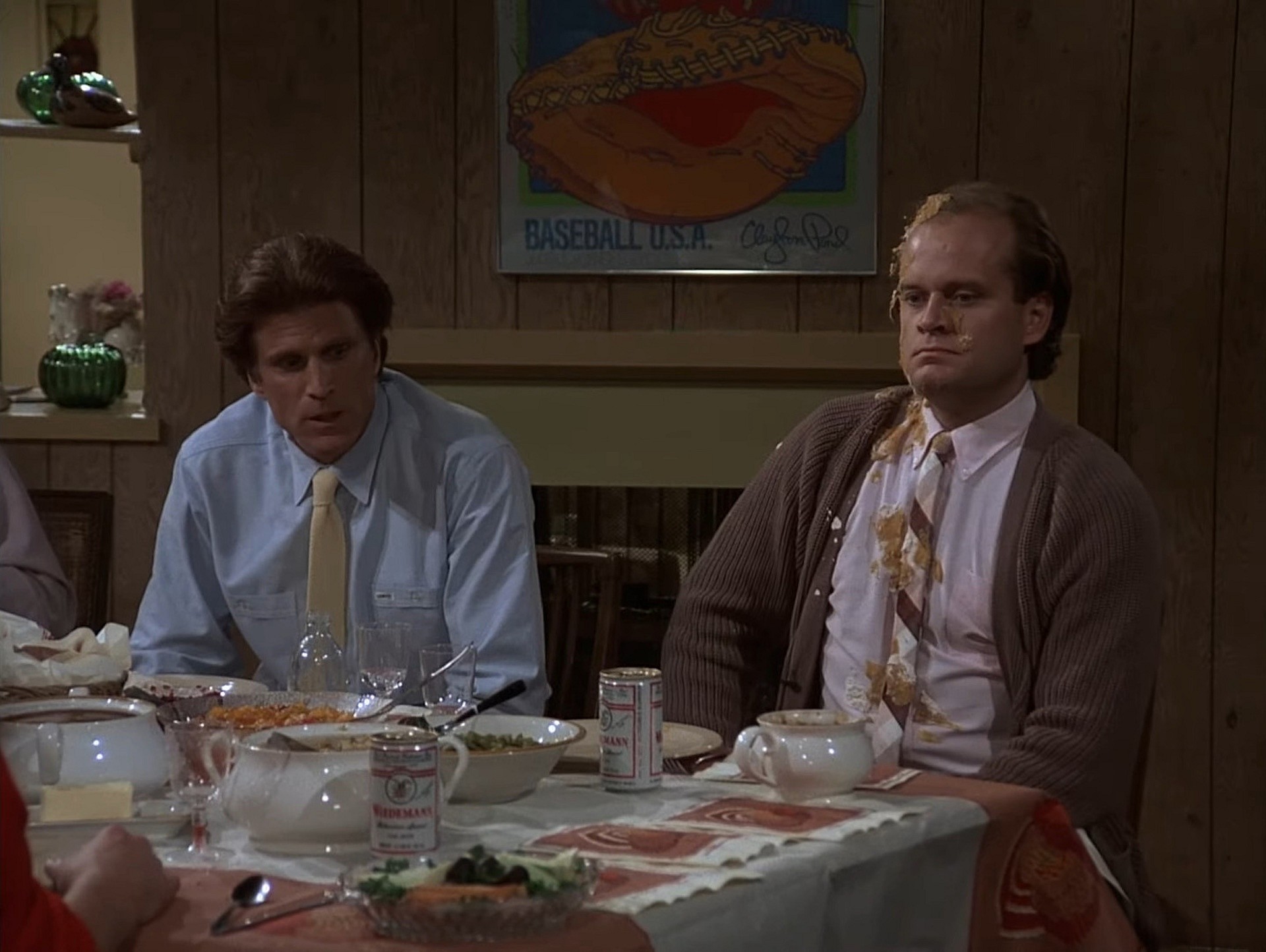 Dr. Frasier Crane (Kelsey Grammer) becomes the first victim of a Thanksgiving food fight in Cheers Season 5 Episode 9 “Thanksgiving Orphans” (1986), Paramount Network Television
