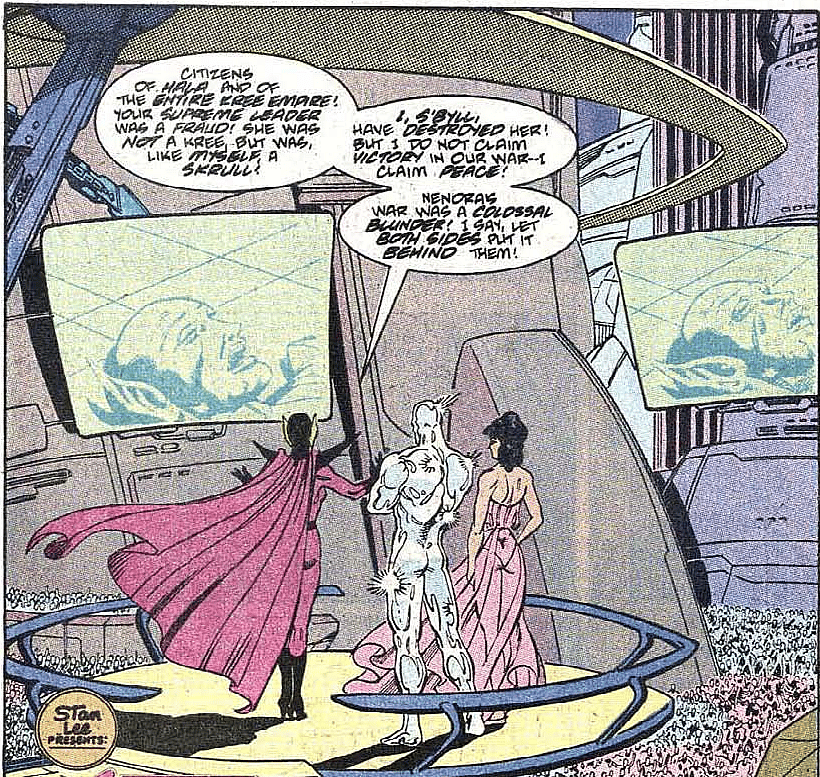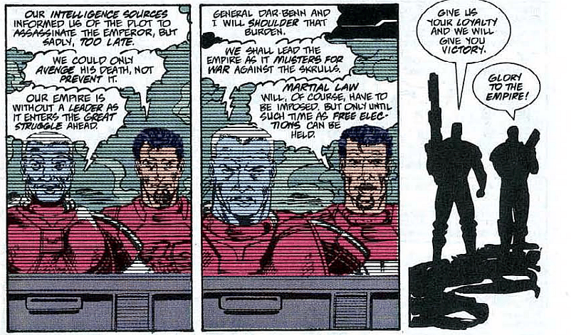 Their plot would be highly successful as the Silver Surfer assassinated Clumsy Foulup and Generals Dar-Benn and Ael-Dan took control of the Kree Empire and with their first act instituted martial law.