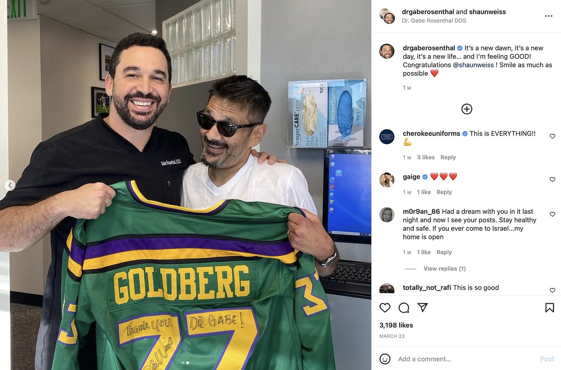 In a separate Instagram post authored by Rosenthal and later shared by the actor, who can be seen therein him a signed version of the hockey jersey that Weiss’ character, Goldberg, wore in The Mighty Ducks as thanks for his work, the dental specialist enthusiastically cheered, “It’s a new day, it’s a new life… and I’m feeling GOOD! Congratulations [Shaun Weiss]! Smile as much as possible.”