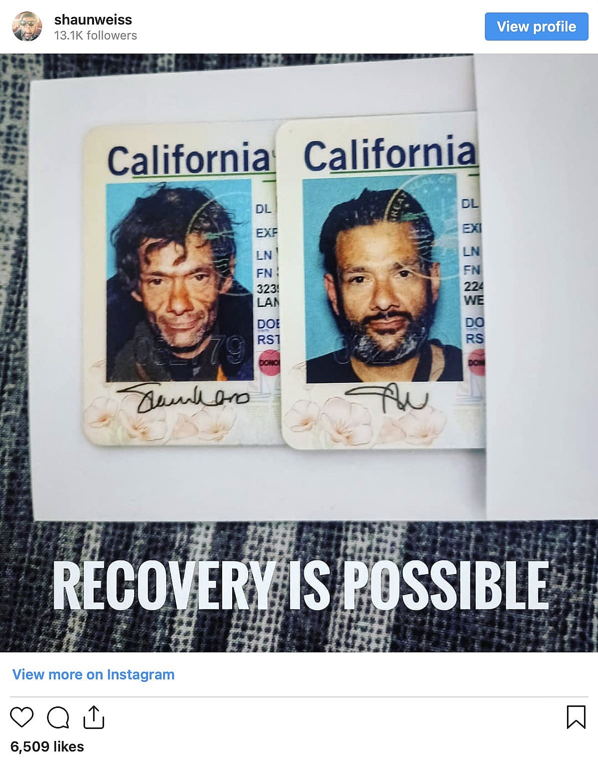 “Recovery is possible,” reads the caption under one of the uplifting comparison pictures shared by Weiss.