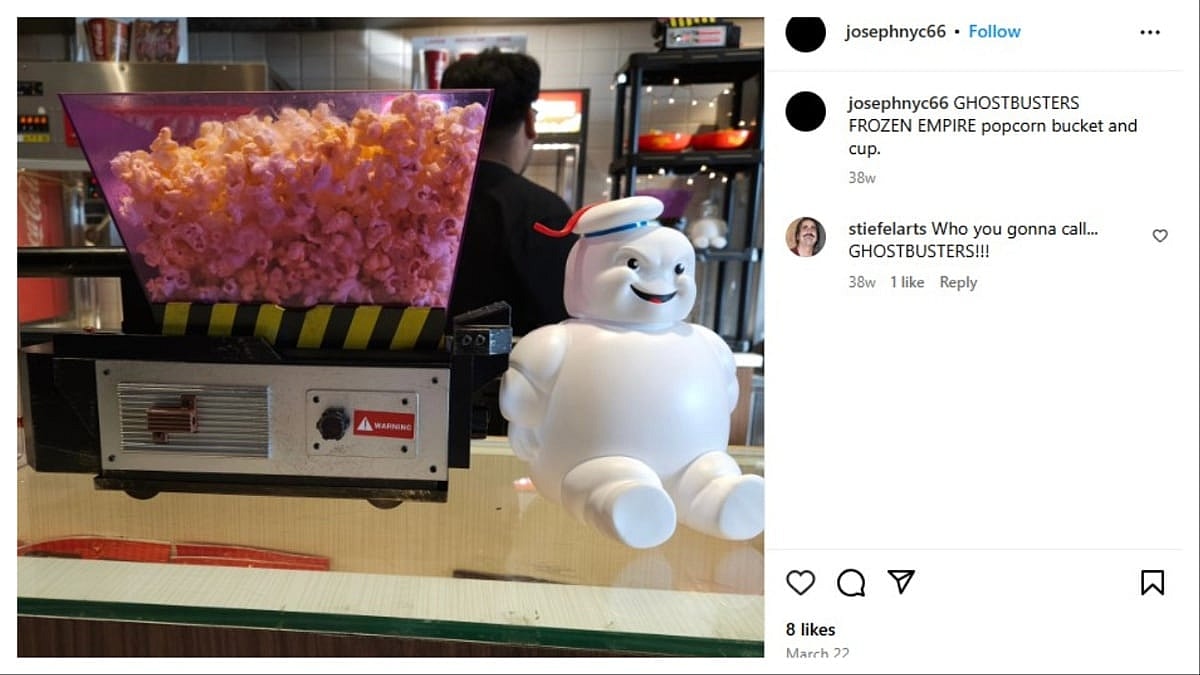 For collectibles, the theatres released multiple fancy buckets, best of all being models of the franchise’s famous ghost trap. The large transparent container on top of the bucket makes the popcorn feel like the prize of a successful ghost hunt. Another bucket features a green translucent Slimer that glows under light while holding a popcorn bucket. For a drinks holder, they offered a limited edition cup shaped like a Stay-Puft Marshmallow Man.