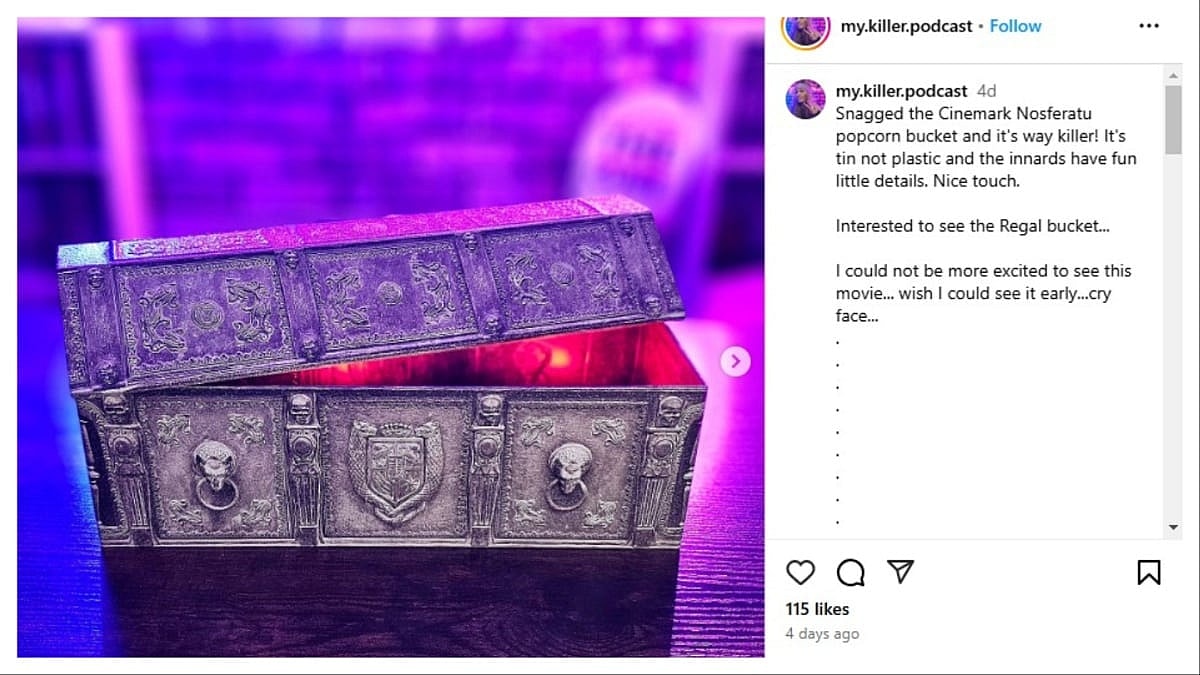 For the popcorn bucket, Cinemark released a limited edition metallic model of Orlok’s coffin with a glowing interior. While it is not the fanciest, it remains one of the most collectible-worthy novelty buckets of 2024, especially because of its metallic body. Its gothic design and rugged exterior make it feel like a true relic of 1800s Germany.