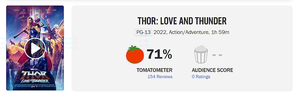 Ben Kendrick at ScreenRant gives the movie an 80 as well. He says, “Thor: Love and Thunder is a return to form for the MCU: delivering a great solo story that is emotional, exciting, and downright funny as hell.”