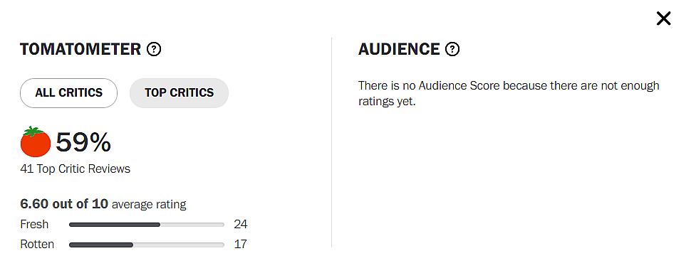 The film has a pretty abysmal score of 59% on the Top Critics Tomatometer with an average rating of 6.6 out of 10 with 24 fresh reviews and 17 rotten reviews.