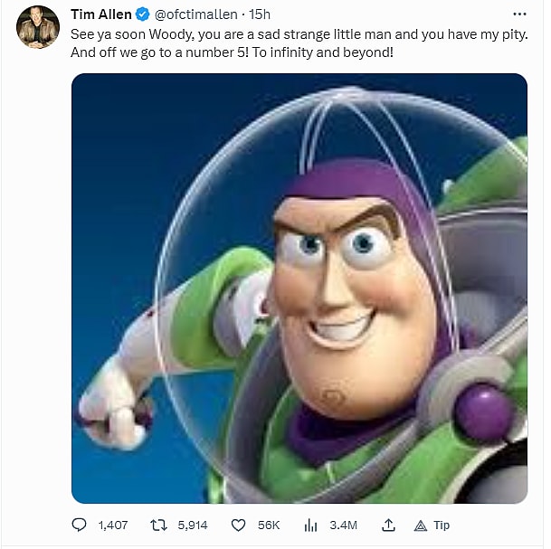 Allen wrote on Twitter, “See ya soon Woody, you are a sad strange little man and you have my pity. And off we go to a number 5! To infinity and beyond!”