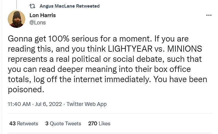 He retweeted Lon Harris who claimed critics were “poisoned” on Twitter, “Gonna get 100% serious for a moment. If you are reading this, and you think LIGHTYEAR vs. MINIONS represents a real political or social debate, such that you can read deeper meaning into their box office totals, log off the internet immediately. You have been poisoned.”