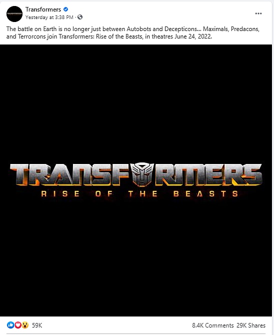 The film was announced on the official Transformers Facebook page who noted, “The battle on Earth is no longer just between Autobots and Decepticons… Maximals, Predacons, and Terrorcons join Transformers: Rise of the Beasts, in theaters June 24, 2022.