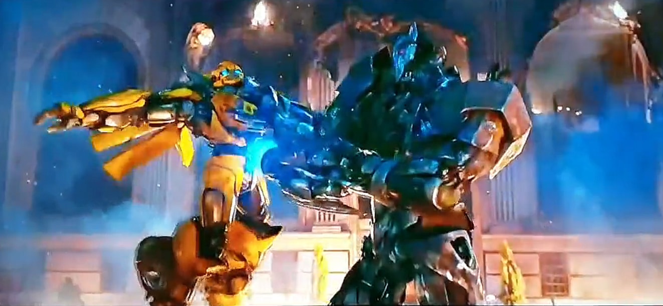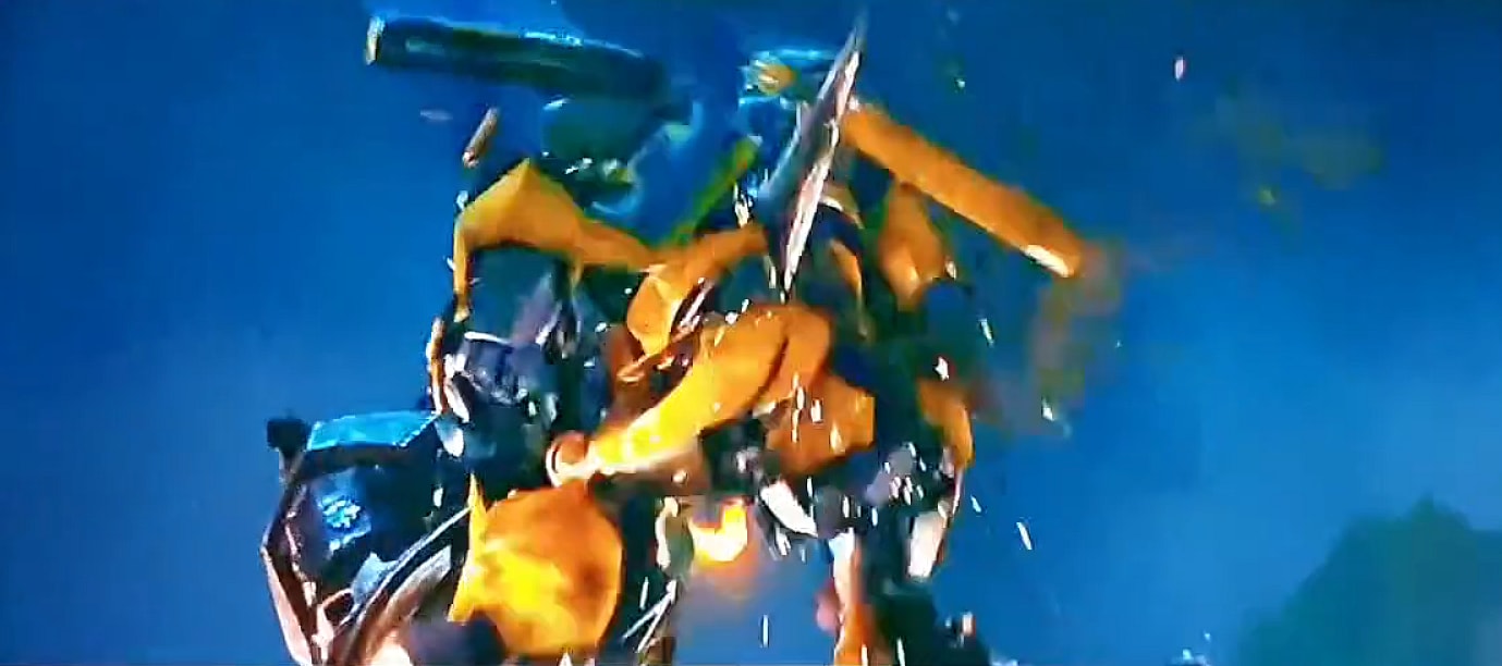 The TV spot then cuts to Scourge saying, “Your world will die.” It then appears to cut back to Scourge and Bumblebee fighting, but instead of Bumblebee being impaled by Scourge, Scourge has his right hand around his neck and is holding him up in the air. He then uses his left hand to obliterate Bumblebee’s chest.