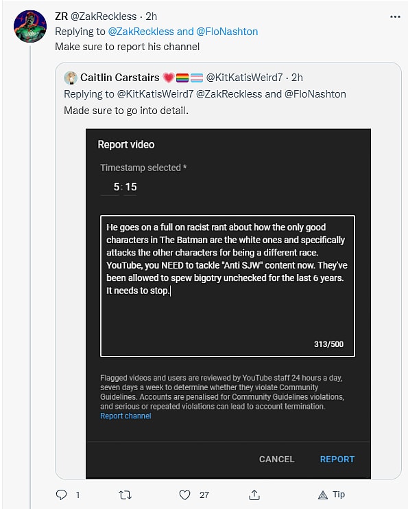 KitKatisWeird7 wrote in her report, “He goes on a full racist rant about how the only good character in The Batman are the white ones and specifically attacks the other characters for being a different race. YouTube, you NEED to tackle ‘Anti SJW’ content now. They’ve been allowed to spew bigotry unchecked for the last 6 years. It needs to stop.”