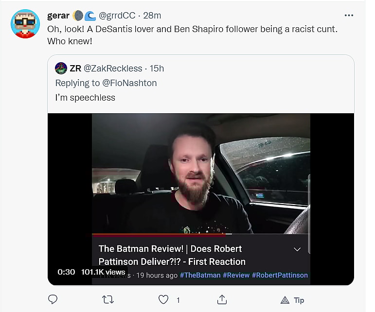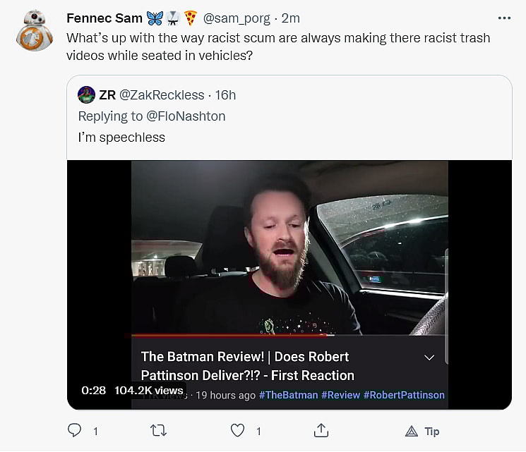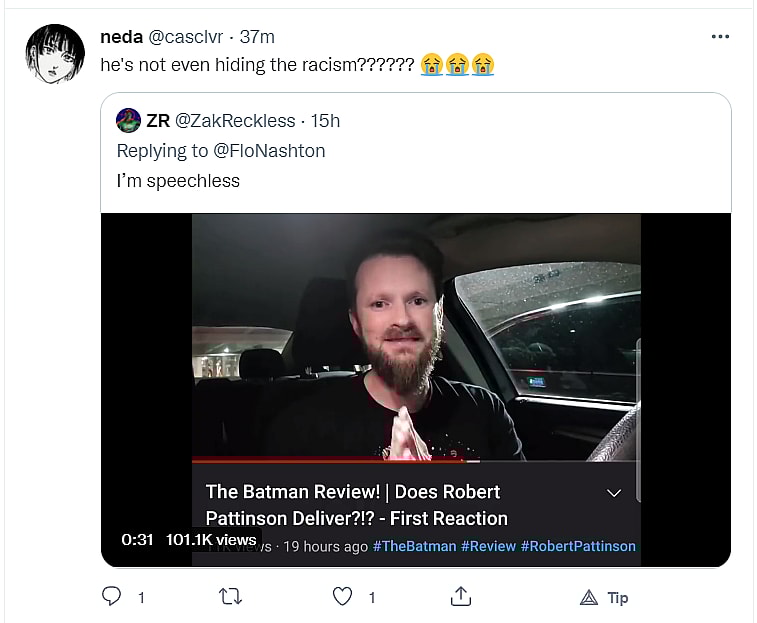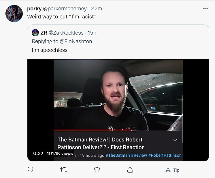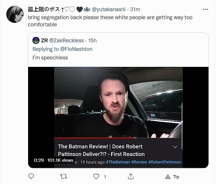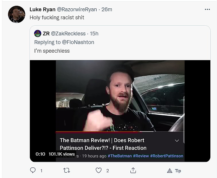 Twitter user ZakReckless took to Twitter where he wrote, “Saw a The Batman review that said he didn’t like that there were more good black people than whites. I’m stunned.”