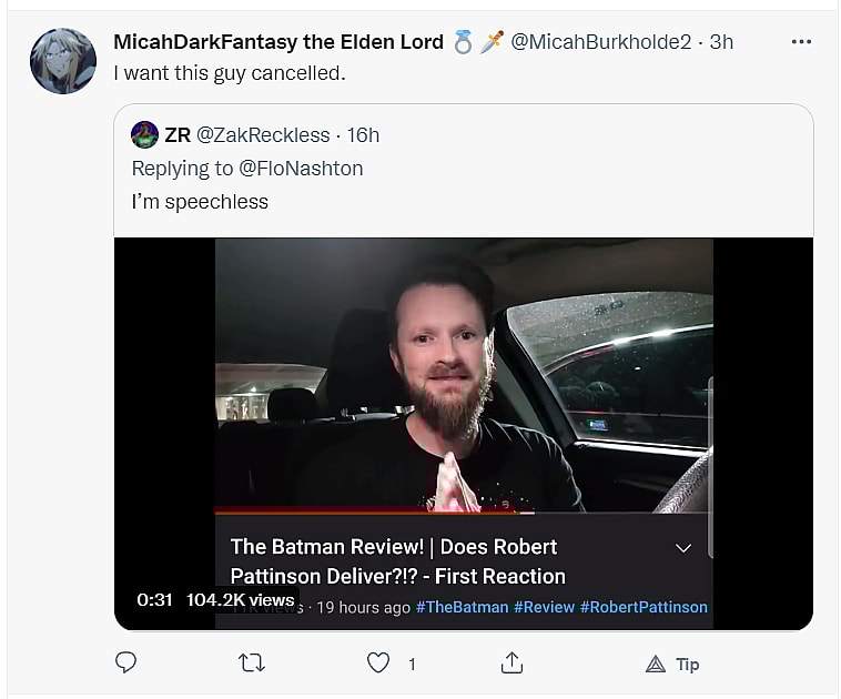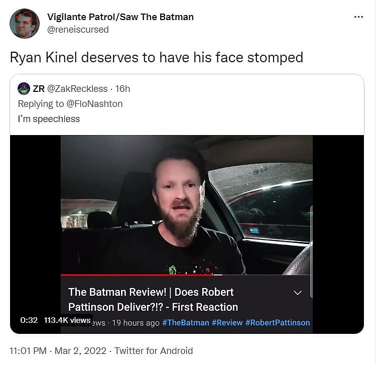 What do you make of Kinel’s review of The Batman? What about the people wanting him cancelled and wishing to inflict violence and death on him?