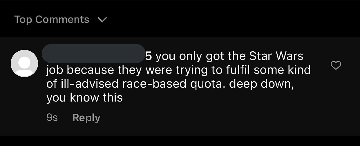 The fourth person allegedly wrote, “You only got the Star Wars job because they were trying to fulfil some kind of ill-advised race-based quota. deep down, you know this.”