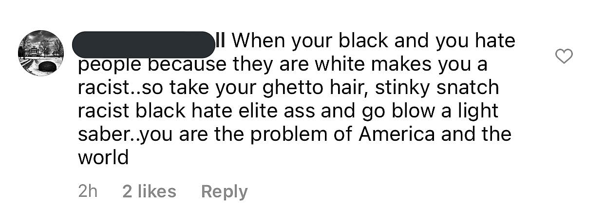 The next alleged message saw a person write, “When your black and you hate people because they are white makes you a racist..so take your ghetto hair, stinky snatch racist black hate elite ass and go blow a light saber..you are the problem of America and the world.”