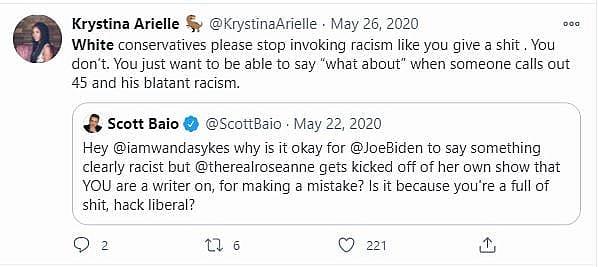 Later in March she would target white conservatives and President Donald Trump writing, “White conservatives please stop invoking racism like you give a s***. You don’t. You just want to be able to say ‘what about’ when someone calls out 45 and his blatant racism.”