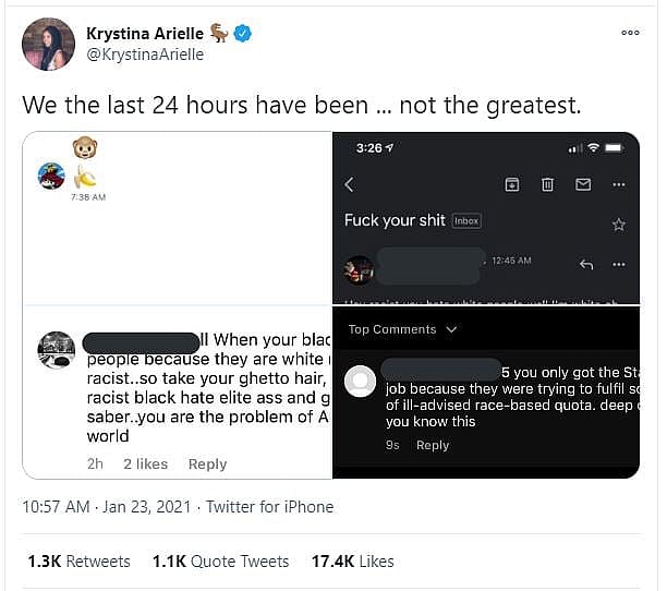 Star Wars host Krystina Arielle still has not addressed her tweets describing white people as racist. However, she did take to social media to share a number of alleged hateful comments directed at her.