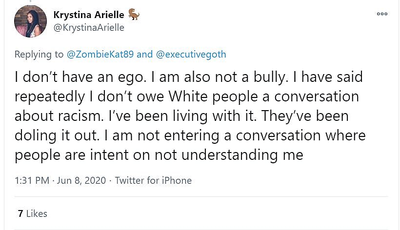 She wrote, “I don’t have an ego. I am also not a bully. I have said repeatedly I don’t owe White people a conversation about racism. I’ve been living with it. They’ve been doling it out. I am not entering a conversation where people are intent on not understanding me.”