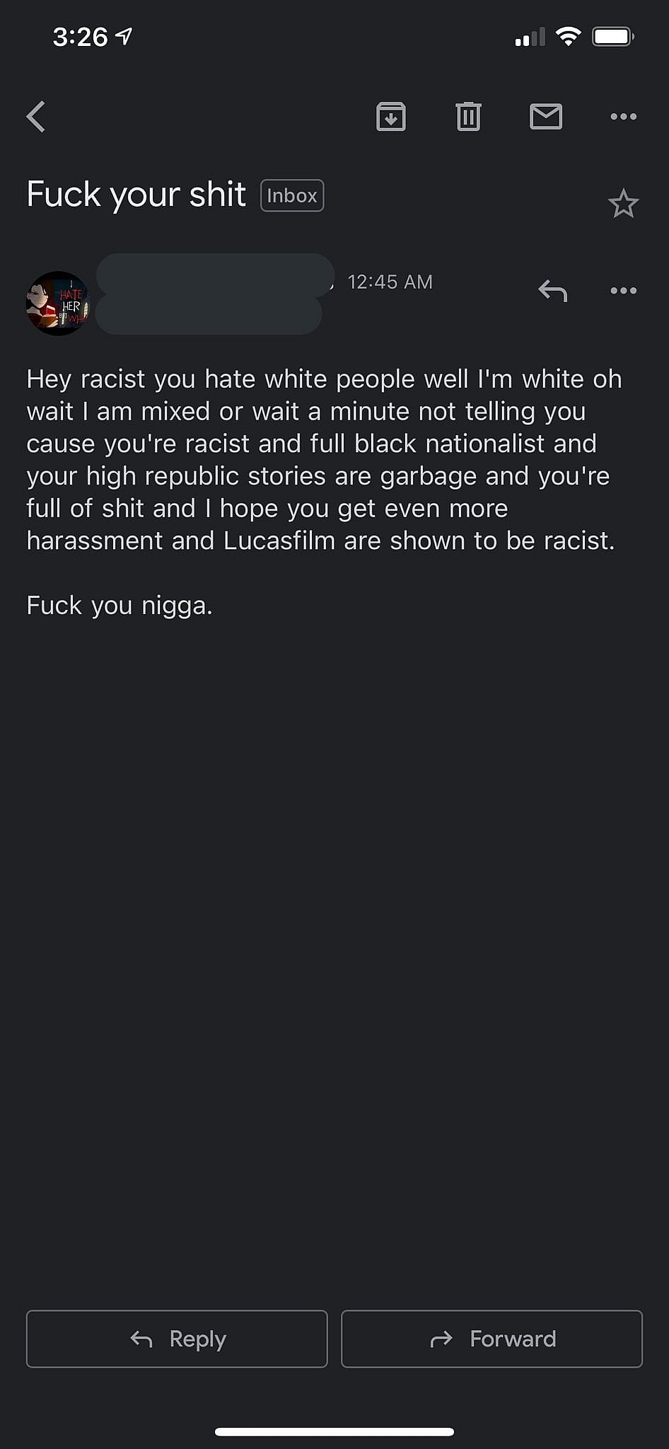Another appears to have sent her an email and wrote, “Hey racist you hate white people well I’m white oh wait I am mixed or wait a minute not telling you cause you’re a racist and full black nationalist and your high republic stories are garbage and you’re full of shit and I hope you get even more harassment and Lucasfilm are shown to be racist. F*** you n****.”