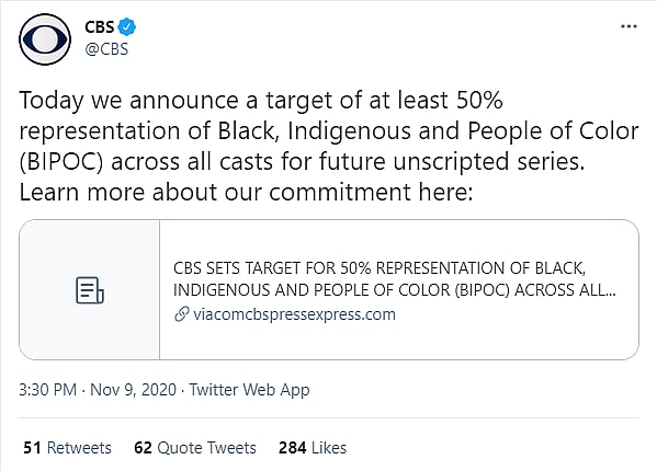 CBS also revealed they planned to implement affirmative action programs. In November 2020, they tweeted, “Today we announce a target of at least 50% representation of Black, Indigenous and People of Color (BIPOC) across all casts for future unscripted series.”