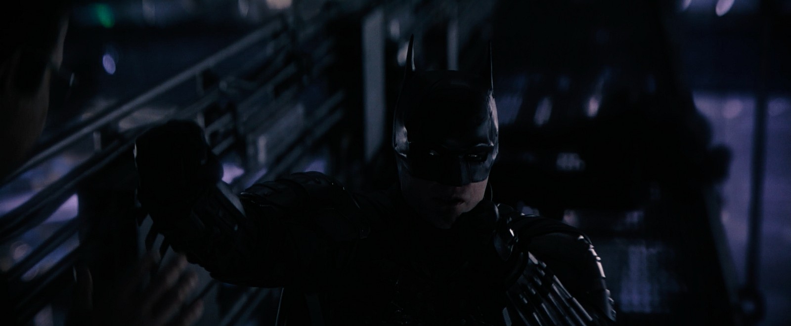 Batman (Robert Pattinson) hanging by a thread in The Batman (2022) via Warner Bros. Pictures