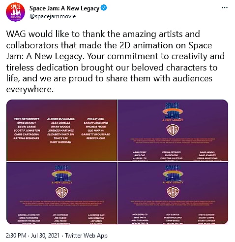 On July 30th, Warner Bros took to the official Space Jam twitter account “to thank the amazing artists and collaborators that made the 2D animation on Space Jam: A New Legacy,” providing four separate ‘credit’ images bearing the names of the previously neglected artists.