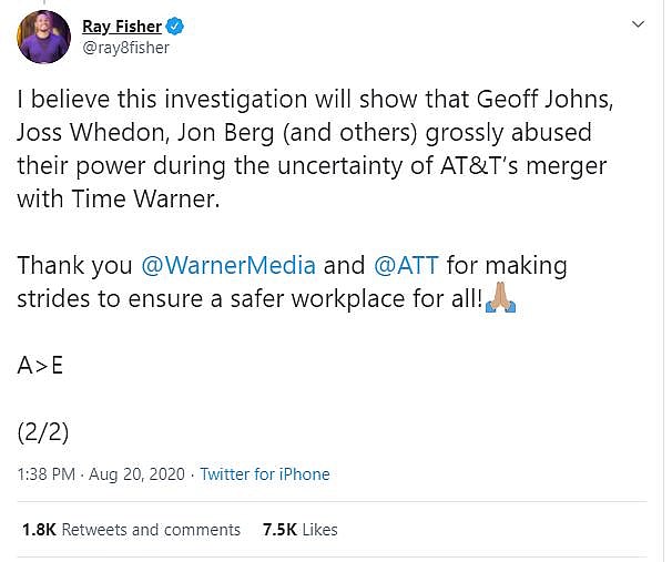 WarnerMedia is investigating allegations made by Cyborg actor Ray Fisher of what occurred on the set of Justice League at the hands of Joss Whedon and Geoff Johns.