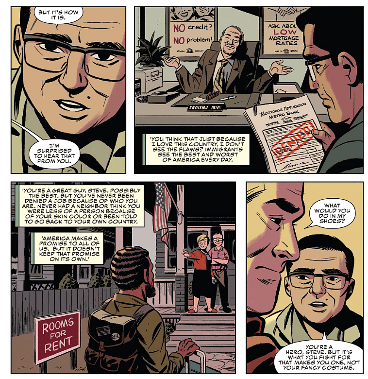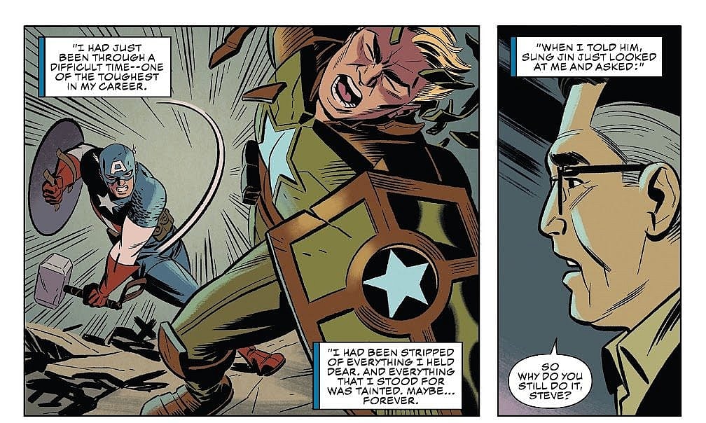 Not only does Rogers get lectured, but just a few pages later, Jeong’s words to Captain America about his privilege are proved a lie.