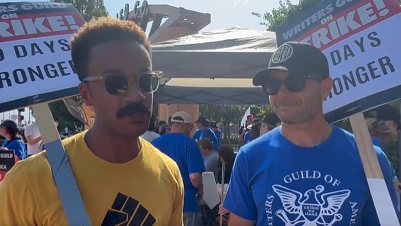 Outside the Disney lot in Burbank, Damon Lindelof and Justin Britt-Gibson share their feelings about the #WritersStrike 100 days in pic.twitter.com/oD1oLMlquD