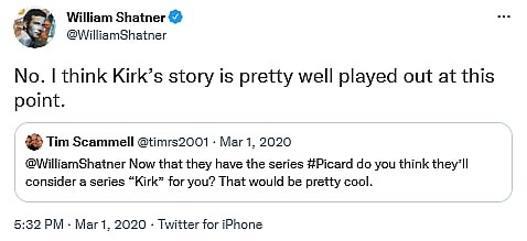 “What was any different about my statement on Kirk that I haven’t said before?” Shatner added in a follow-up tweet. “I don’t do cameos (that one stretches back to 2008 & JJ) Kirk’s story is well told out of any other captain’s story. Kirk died in Generations. What is really left? Adventures in the ribbon?”