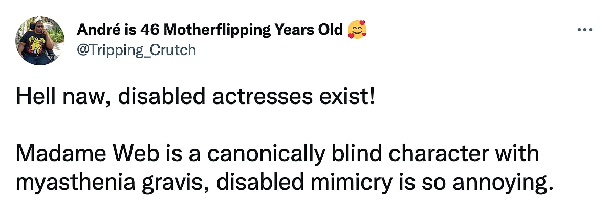 “Hell naw, disabled actresses exist!” one Twitter user wrote. “Madame Web is a canonically blind character with myasthenia gravis, disabled mimicry is so annoying.”