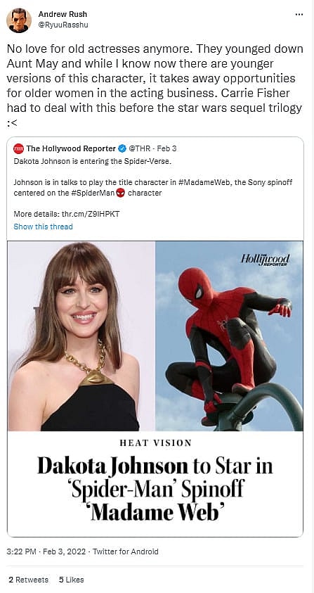One user wrote, “No love for old actresses anymore. They younged down Aunt May and while I know now there are younger versions of this character, it takes away opportunities for older women in the acting business. Carrie Fisher had to deal with this before the star wars sequel trilogy :<”