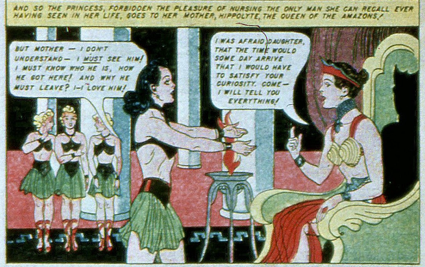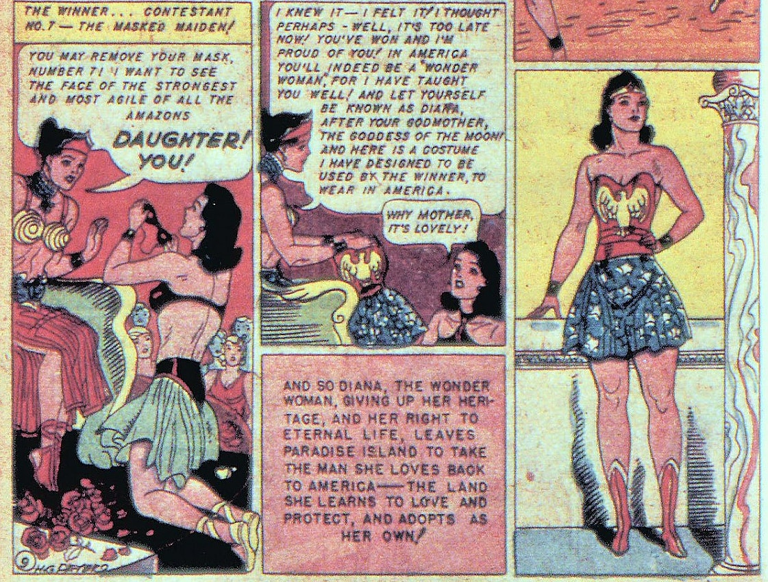 The books ends with Wonder Woman creator Charles Moulton writing, “And so Diana, the Wonder Woman, giving up her heritage, and her right to eternal life, leaves Paradise Island to take the man she loves back to America — the land she learns to love and protect, and adopts as her own!”