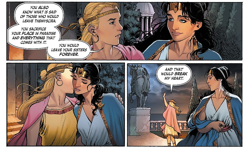 Rucka responded, “Then, yes.” He would elaborate and say, “Now, are we saying Diana has been in love and had relationships with other women? As Nicola and I approach it, the answer is obviously yes. And it needs to be yes for a number of reasons. But perhaps foremost among them is, if no, then she leaves paradise only because of a potential romantic relationship with Steve [Trevor]. And that diminishes her character. It would hurt the character and take away her heroism.”