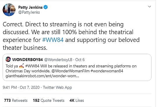 Jenkins wrote on Twitter, “Director to streaming is not even being discussed. We are still 100% behind the theatrical experience for Wonder Woman 1984 and supporting our beloved theater business.”