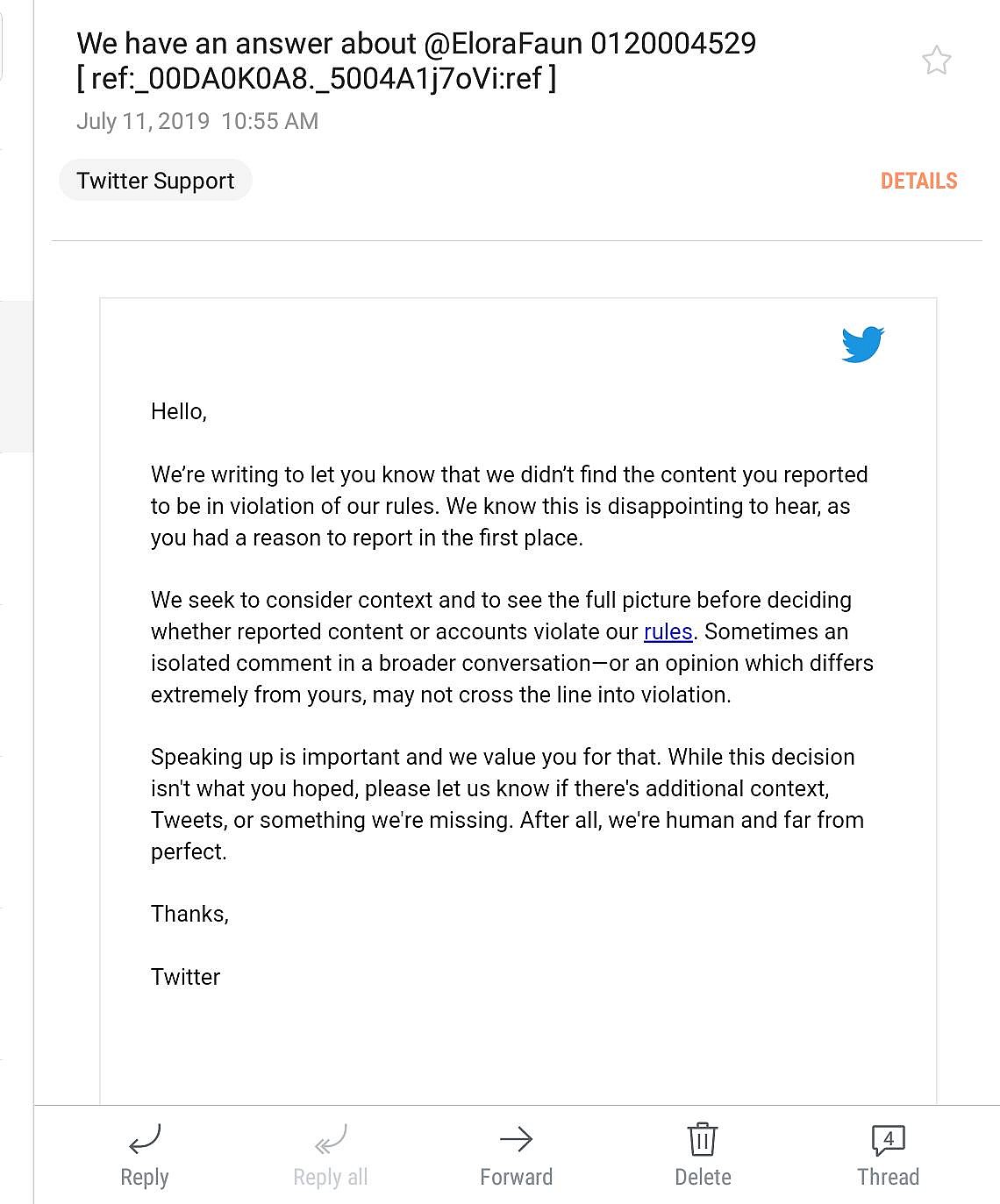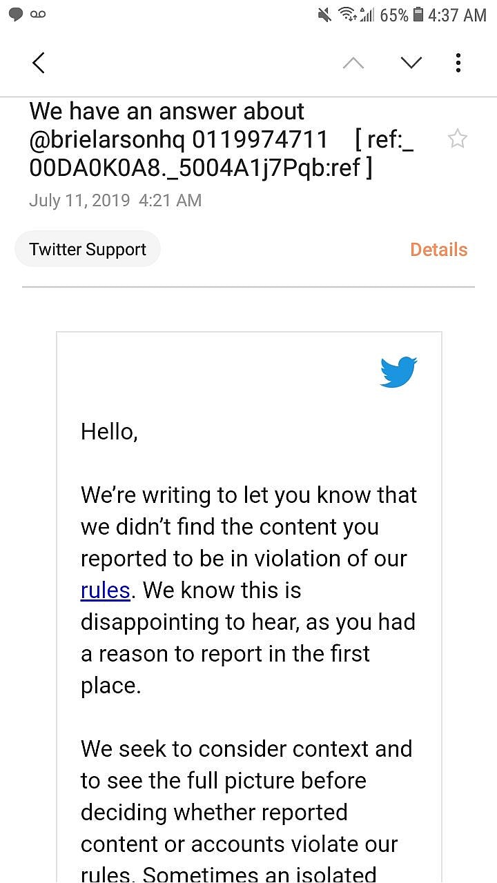 MechaRandom did indicate to me that she reported both BrieLarsonHQ and EloraFaun to Twitter. She told me, “I spent hours reporting them, but the person brigading didn’t violate terms.” She shared with me her responses from Twitter indicating both BrieLarsonHQ and EloraFaun did not violate Twitter’s terms.