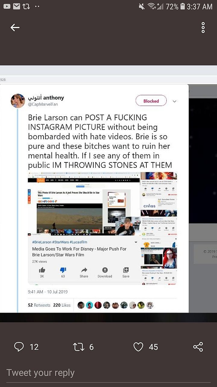 Mecha Random responded to the threats via her YouTube channel. In the video she warns Brie Larson about @CapMarvelFan, “This is kind of a warning to Brie Larson. You need to get somebody on this guy. You need to have your security know about this guy. He’s a very obsessed Captain Marvel fan. And he stalks us, threatening violence.”