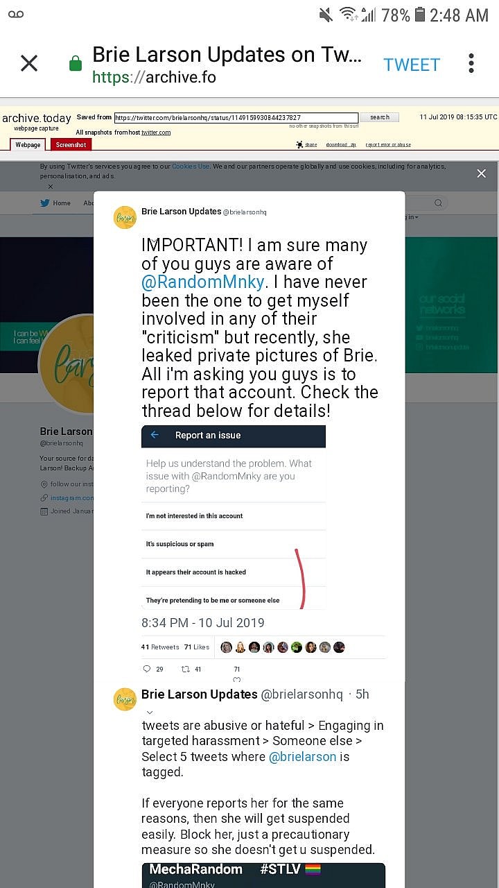Following her response, the BrieLarsonHQ account called on their followers to brigade MechaRandom’s Twitter and mass report her to Twitter. Not only did they call for their followers to mass report MechaRandom, but also provided instructions on how to do so. In the now deleted tweet, they wrote, “If everyone reports her for the same reasons, then she will get suspended easily.” They then advised for people to “block her, just a precautionary measure so she doesn’t get u suspended.”