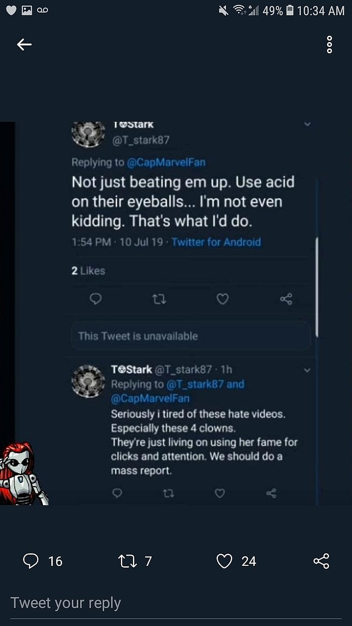 Other users agreed with CapMarvelFan. One user T_Stark87 called for violence writing, “Use acid on their eyeballs.. I’m not even kidding. That’s what I’d do.”
