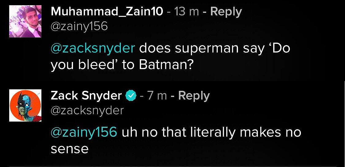 Snyder first confirmed that Superman will not ask Batman if he bleeds. When asked if the line would be included, Snyder responded, “uh no that literally makes no sense.”