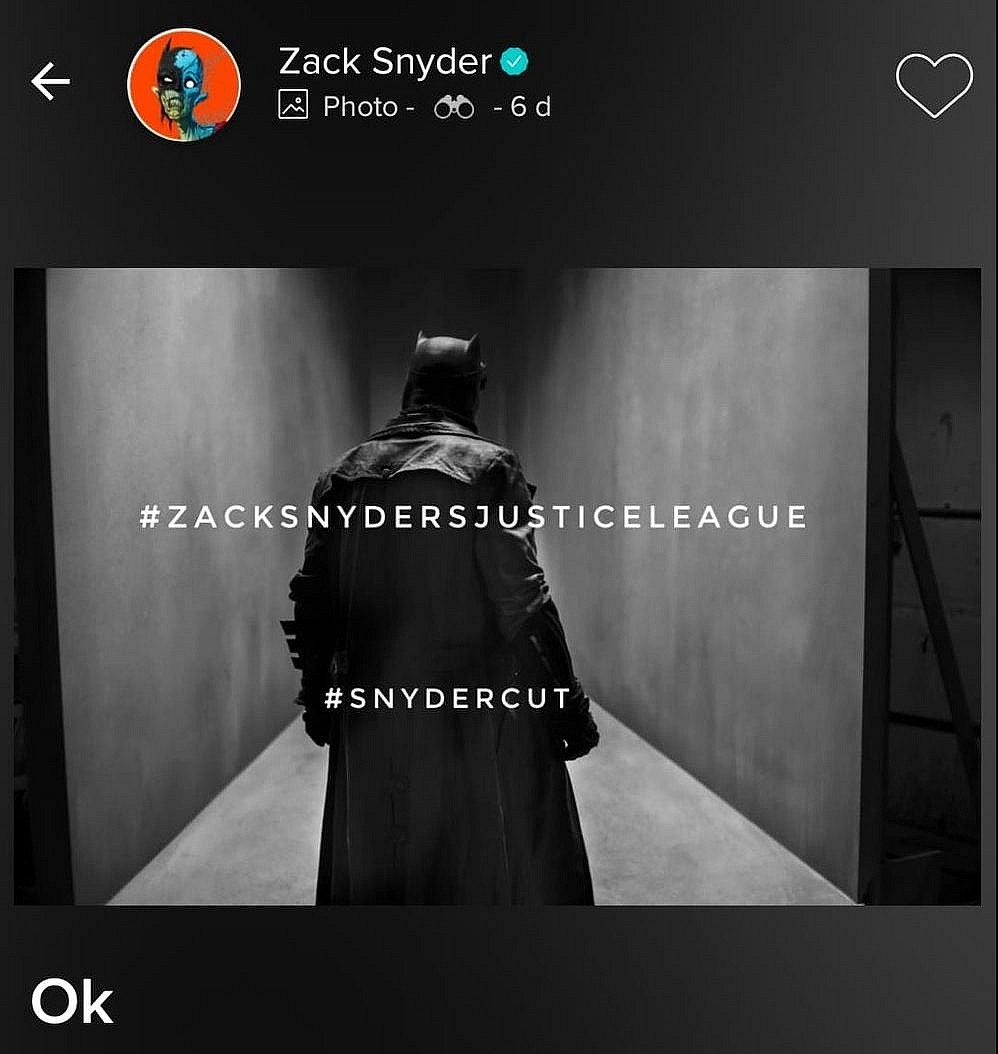 Snyder previously shared an image of Batman standing in a hallway or within Joker’s cell taken from behind to his Vero account.