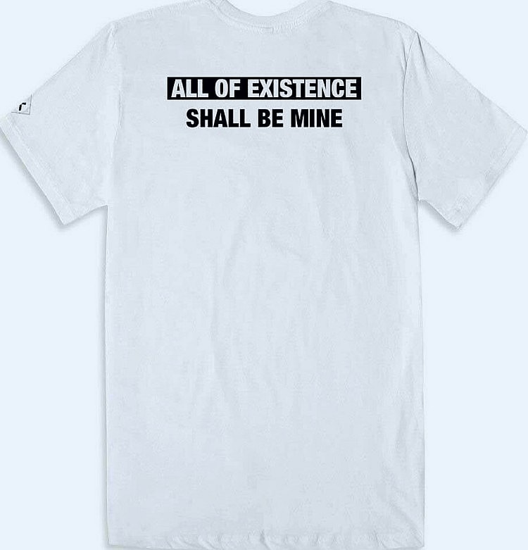 The shirt is white but does feature the cool-looking representation on the front. Inscribed on the back is the phrase “ALL EXISTENCE SHALL BE MINE,” a phrase that sounds completely natural coming from the Lord of Apokolips’ mouth.