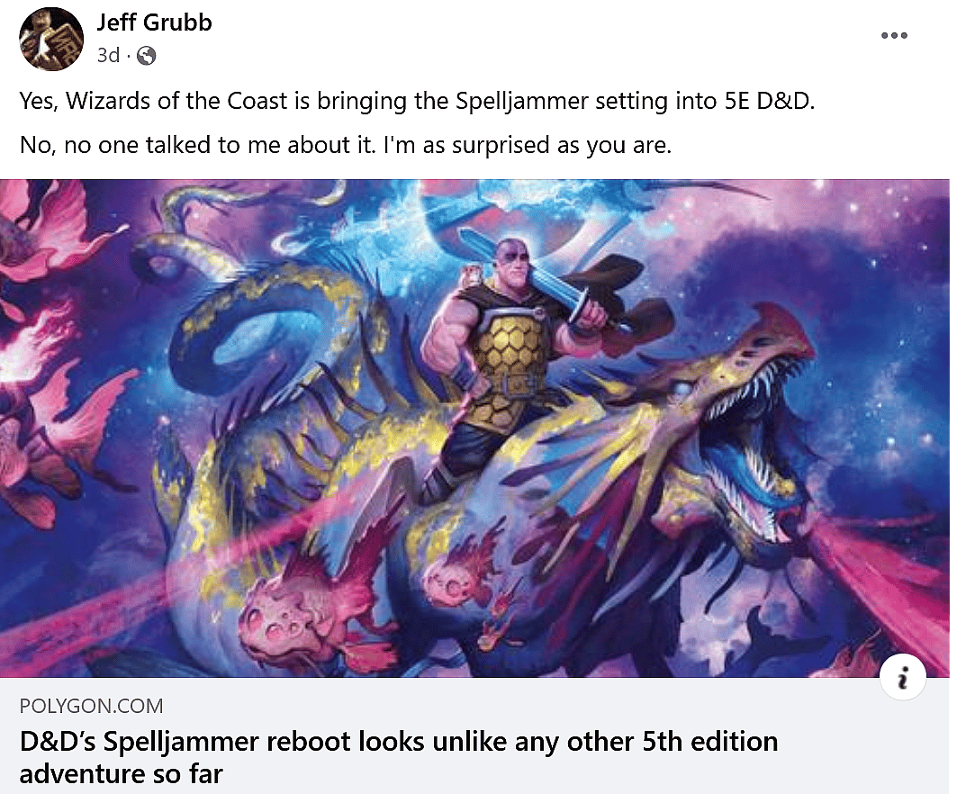 As news of Spelljammers’ revival began to spread, Jeff Grubb, the writer who created the initial Spelljammer: Adventures in Space 2E campaign setting for the original Gary Gygax-led incarnation of TSR Games in 1989, took to his personal Facebook to tell players, “Yes, Wizards of the Coast is bringing the Spelljammer setting into 5E D&D. No, no one talked to me about it.”